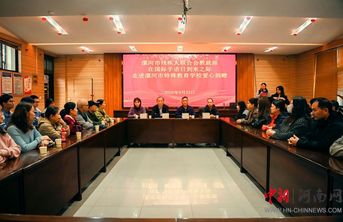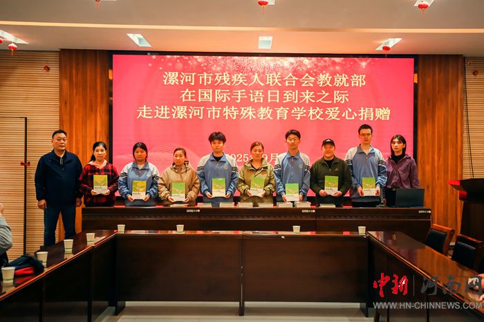 中新河南网9月25日电(任钱坤)2025年9月23日是国际手语日,在这一特殊日子里,河南省漯河市残疾人联合会走进漯河市特殊教育学校,开展了一场意义非凡的捐赠活动,为听障学生和聋人协会送去了沟通的“钥匙”——80余本《国家通用手语--日常会话》教材,助力他们更好地融入社会,促进手语知识普及。