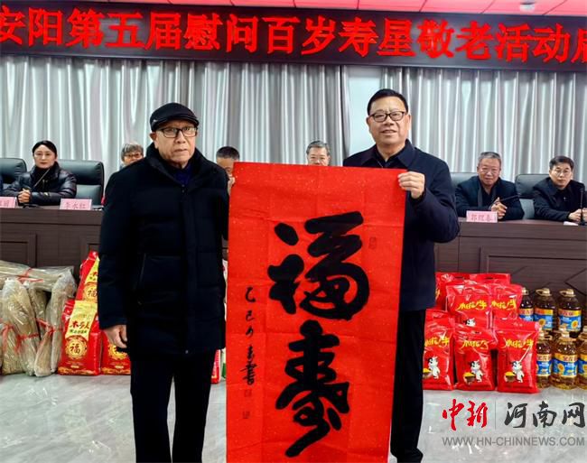 12月24日上午。他应邀参加了安阳市孝文化第五届慰问百岁老人启仪式。将精心准备好的16幅《福寿》作品赠送给安阳县孝文化促进会,分别送给了16位百岁老人。
