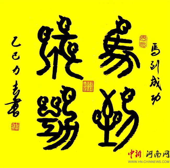 近日,将送去了2025年,迈进新的一年2026马年了。赵力志同志仍满怀酬志迎接新的征程,他用传统的书法艺术设计书写了红红火火的对联《金蛇飞舞辞旧岁,万马奔腾迎新年》。一幅为行书,一幅为鸟虫篆。他还书写了《马到成功》、《龙马精神》等作品。将用这些催人奋进的文字在春节到来之际,义写春联为人们书写服务,欢度人生岁月。