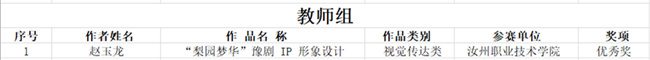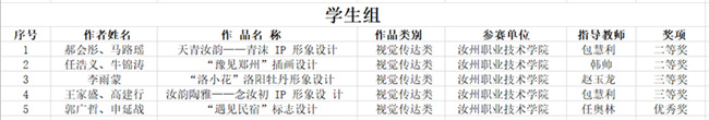 其中,郝会彤、马路瑶共同完成的《天青汝韵——青沫 IP 形象设计》,任浩义、牛锦涛共同完成的《“豫见郑州”插画设计》分别获得学生组二等奖;李雨蒙的《“洛小花”洛阳牡丹形象设计》,王家盛、高建行共同完成的《汝韵陶雅——念汝初 IP 形象设计》分别获得学生组三等奖;郭广哲、申延战共同完成的《“遇见民宿”标志设计》荣获学生组优秀奖;赵玉龙的《“梨园梦华”豫剧 IP 形象设计》获教师组优秀奖。