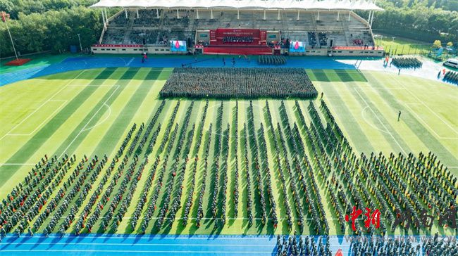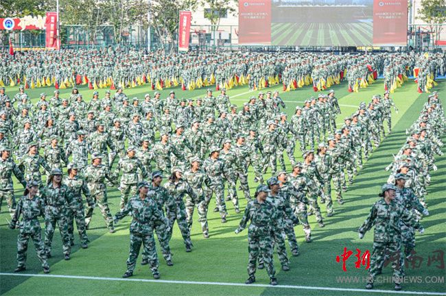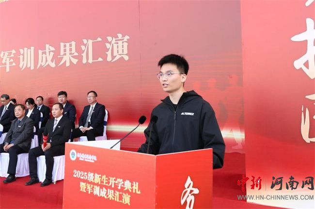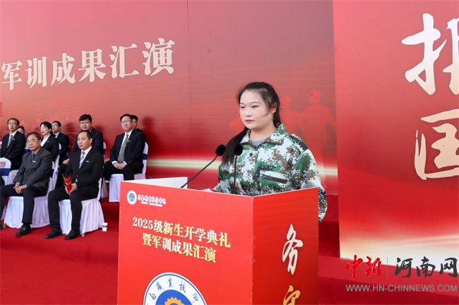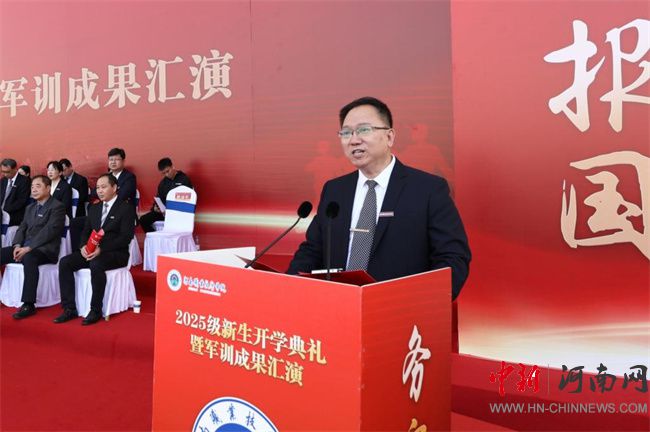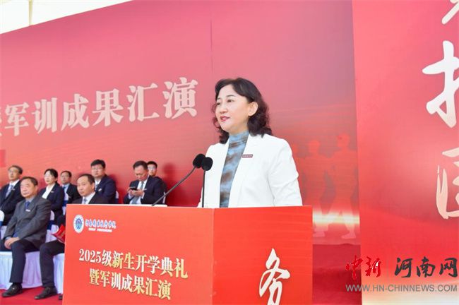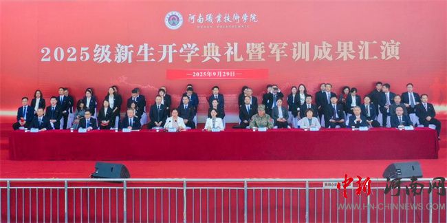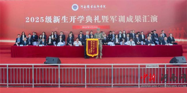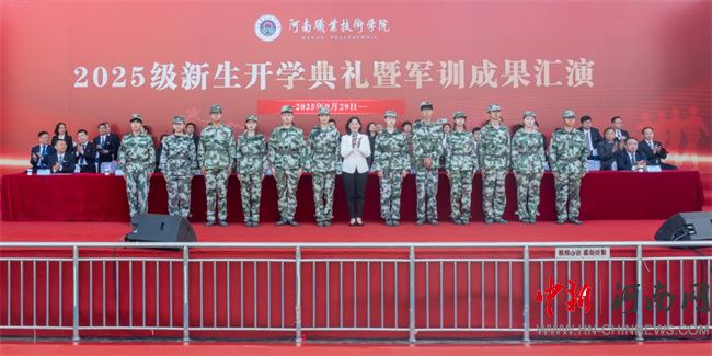 中新河南网9月30日电(刘明库) 9月29日上午,河南职业技术学院举行2025级新生开学典礼暨军训成果汇演。夏新颜、田华、肖珑、李玉峰、盛兴文、任枫轩、鲁冬、朱永宽等在校校领导,金水区人民武装部选派总教官张利南出席典礼。校属各单位党政负责人,各二级学院党总支副书记、团总支(学工办)书记、新生辅导员及2025级全体新生参加典礼。校党委副书记、工会主席田华主持典礼。