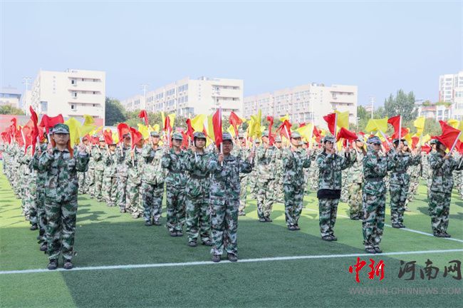 典礼在雄壮的国歌声中拉开帷幕。校党委副书记、校长夏新颜宣布2025级新生军训成果汇演开始,并为新生代表配发校牌。校党委委员、副校长李玉峰向金水区人民武装部赠送锦旗。