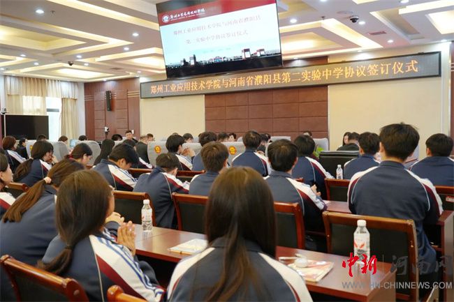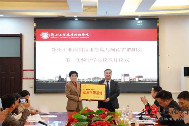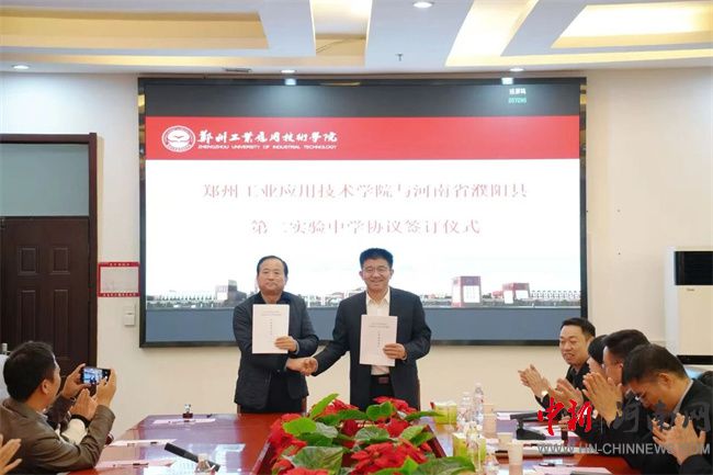 中新河南网10月17日电 10月16日,郑州工业应用技术学院与河南省濮阳县第二实验中学生源基地协议签订仪式在行政管理中心二楼会议室举行。此次签约,不仅是郑工学院发展史上开启教育新篇章的重要征程,更是通过与基础教育领域优质学校的深度融合,将共建生源基地转化为推动校地教育协同的具体实践。濮阳县第二实验中学教育集团董事长蔡玉坤,校长张克来、副校长段盈武等班子成员及师生代表;中原华信控股集团总裁、郑州工业应用技术学院理事长谷建光,校长闫兵携班子成员、有关部门负责人参加签订仪式。签订仪式由郑州工业应用技术学院副校长贾圣强主持。