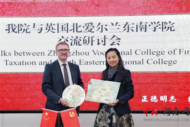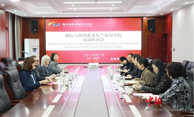 中新河南网10月19日电 为拓展学校专业发展的国际化视野,促进中英教育理念的交流互鉴,10月16日,郑州财税金融职业学院与英国北爱尔兰东南学院代表团举行交流研讨会。北爱尔兰东南学院校长托马斯·罗伯特·马丁(Thomas Robert Martin)、副校长希瑟·维拉·麦基(Heather Valerie McKee)及国际发展高级经理伊莱恩·麦基翁(Elaine Mckeown)一行到访该校。郑州财税金融职业学院副院长耿聪慧出席会议,相关部门负责人参加交流。会议由国际教育中心主任胡莉莉主持。