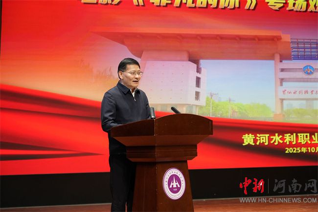 刘林亚致辞。他指出,省教育厅始终将“强化思政引领、推动产教融合、培育特色名校”作为工作重点,持续为高校高质量发展保驾护航。电影《非凡的你》以红旗渠设计师、黄河水利职业技术大学杰出校友吴祖泰为原型,生动诠释了红旗渠精神,为全省高校开展红色思政教育提供了一部鲜活的“教材”。希望黄河水利职业技术大学以本次活动为契机,进一步把红旗渠精神融入办学治校、教书育人全过程,培养更多像吴祖泰一样“有理想、敢担当、能吃苦、肯奋斗”的新时代水利人;希望全省高校以《非凡的你》为范例,探索更多“艺术 + 思政”“行业+育人”新路径,让思政育人更有温度、更接地气、更入人心;也希望青年学子们从影片中汲取“不认命、不服输”的力量,把个人理想融入国家发展大局,在技能报国、强国建设的征程中,书写属于自己的“非凡”篇章。