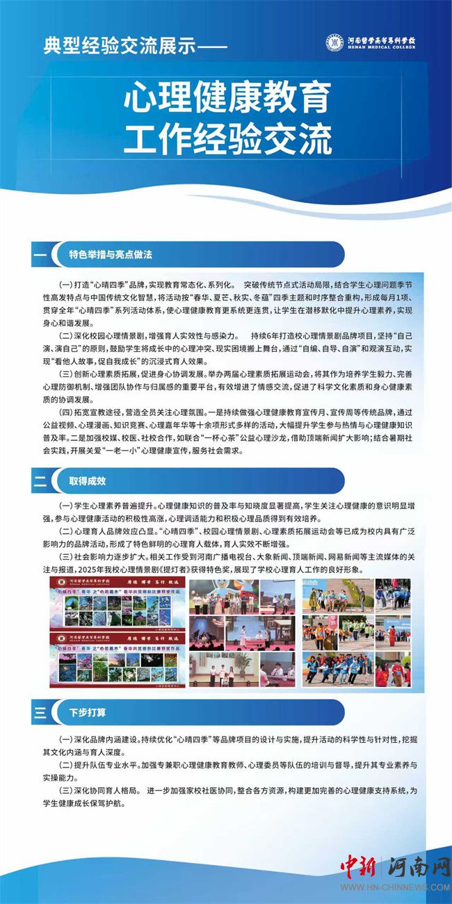 系列举措取得了扎实成效。目前,学生心理素养普遍提升,主动关注心理健康的意识显著增强;“心晴四季”、心理情景剧等心理育人品牌效应凸显,形成了特色鲜明的育人载体;相关工作获河南广播电视台等主流媒体多次报道,心理情景剧《提灯者》荣获特色奖,社会影响力逐步扩大。