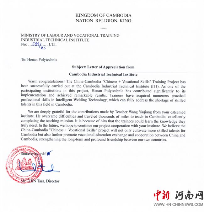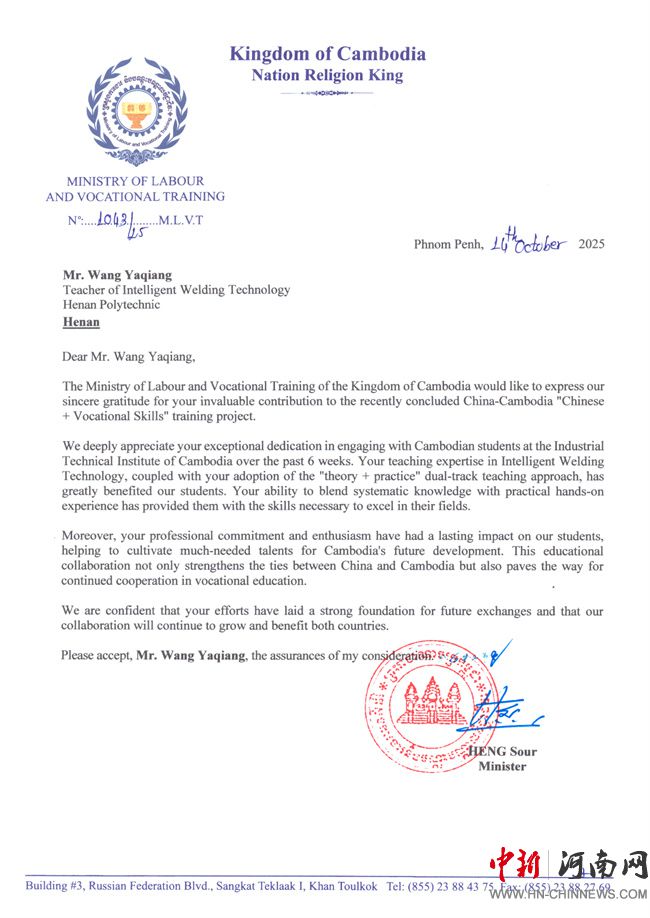 中新河南网10月29日电(王亚强、韩瑞) 近日,河南职业技术学院收到来自柬埔寨劳工与职业培训部和工业技术学院发来的两封感谢信。信中写道:感谢你们为中国—柬埔寨“中文+职业技能”项目所做的贡献,王亚强老师倾心指导柬埔寨学员的敬业精神令人感佩,您凭借智能焊接技术领域的专业造诣,采用“理论+实践”双轨并行的教学模式,使学员们受益匪浅……