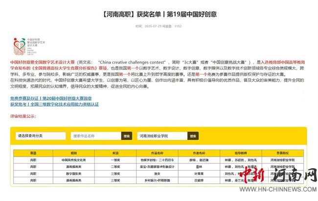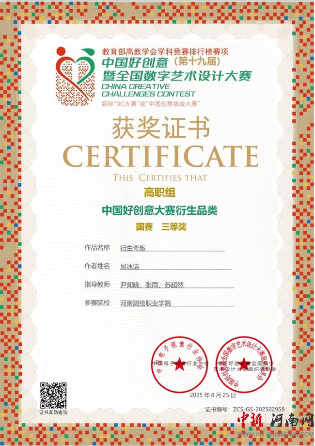中新河南网11月7日电(文/尹闻晓) 近日,第19届中国好创意暨全国数字艺术设计大赛全国总决赛结果揭晓。河南测绘职业学院参赛团队表现出色,共获全国三等奖1项、省级一等奖1项、二等奖1项、三等奖2项,实现了该校在该项国家级赛事中的成绩新突破。