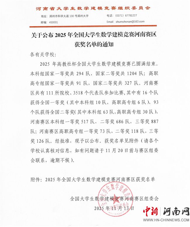 中新河南网11月17日电(王红楠) 近日,2025年全国大学生数学建模竞赛落下帷幕。河南测绘职业学院参赛团队凭借扎实的专业基础、严谨的逻辑思维与出色的团队协作,在激烈竞争中脱颖而出,共获省级一等奖2项、二等奖2项、三等奖2项,充分展现了该校在学科建设和创新人才培养方面的扎实成效。