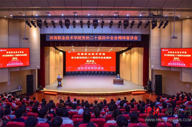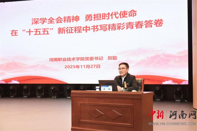 中新河南网11月30日电(谷世飞) 11月27日下午,河南职业技术学院党委书记厉励以《深学全会精神、勇担时代使命——在“十五五”新征程中书写精彩青春答卷》为题,为学校青年学生宣讲党的二十届四中全会精神。第七期校青马班学员、第一期团校学员、校院两级学生会主要学生干部代表、国旗护卫队全体成员、电子与物联网学院电子信息工程技术253班全体同学,以及党委宣传部、校团委等部门负责同志共500余人现场聆听。校党委副书记、工会主席田华主持宣讲会。