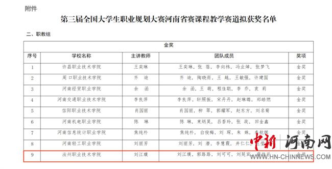 中新河南网12月2日电 在近日闭幕的第三届全国大学生职业规划大赛河南省赛课程教学赛道决赛中,由汝州职业技术学院(以下简称该校)校长刘延宾、副校长薛佳乐率领,刘江璞、郭路路、刘可可三位老师参加的比赛团队,凭借出色的课程设计与扎实的教学功底,在全省101支入围现场决赛的教师团队中脱颖而出,荣获金奖。