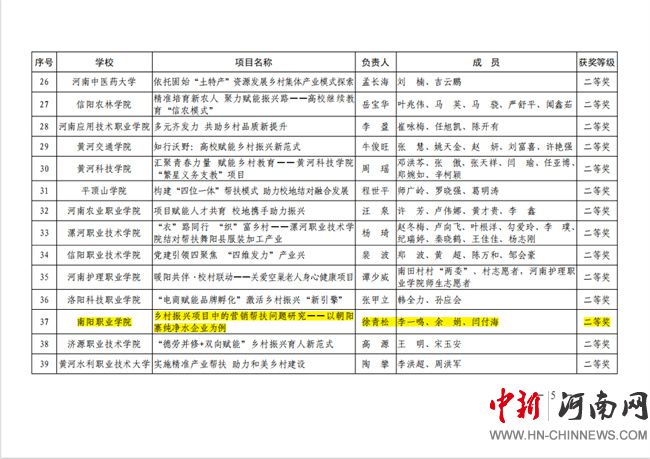 中新河南网12月9日电 近日,2025年河南省高等学校精准帮扶典型项目推选结果公布,南阳职业学院报送的南阳西峡县丹水镇朝阳村精准帮扶项目《乡村振兴项目中的营销帮扶问题研究——以朝阳寨纯净水企业为例》荣获二等奖。
