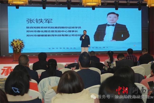 上午的最后一个分享,来自郑州市春化雨志愿互助中心的理事长张铁军老师,他分享的题目是《学习阳明心学 助力天下无孤》。铁军理事长因一次偶然的契机接触到中华优秀传统文化,通过一次线下学习,他认定了一生追随的博仁老师。
