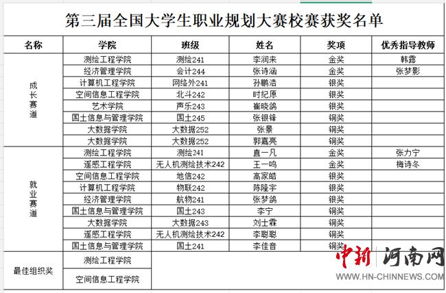 经过激烈角逐,李润来、直一凡等4名选手分获成长赛道与就业赛道金奖;孙鹏浩、高家浩等6人获得银奖;李宁、张银峰等7人获得铜奖。韩露、张力宁、张梦影、梅诗冬4位教师获评“优秀指导教师”;测绘工程学院、空间信息工程学院荣获“优秀组织奖”。