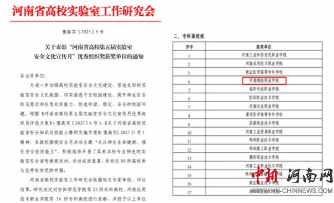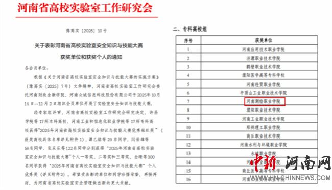 中新河南网12月30日电(文/谭永超) 12月28日,河南省高校实验室工作研究会发布《关于表彰河南省高校实验室安全文化宣传月优秀组织奖的通知》(豫高实[2025] 9号),《关于表彰河南省高校实验室安全知识与技能大赛获奖单位和获奖个人的通知》(豫高实[2025] 10号)。河南测绘职业学院在两项评选中均获表彰,荣获“河南省高校第五届实验室安全文化宣传月优秀组织奖”和“2025年河南省高校实验室安全知识与技能大赛优秀组织奖”。这是对该校长期重视并扎实推进实验室安全工作的充分肯定。