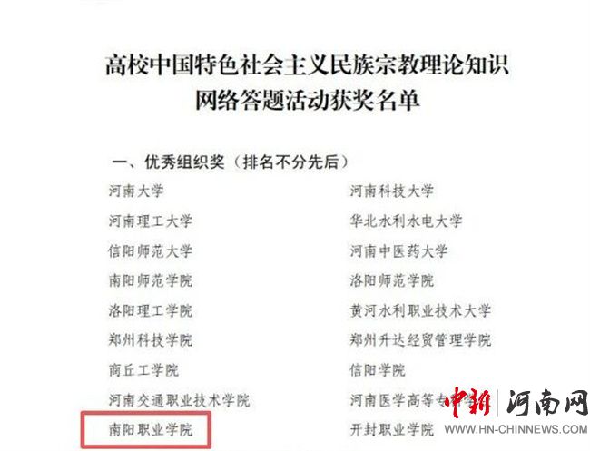 中新河南网12月31日电 近日,河南省民族宗教委办公室、河南省教育厅办公室、河南省体育局办公室联合公布了“豫来豫亲——铸牢中华民族共同体意识主题教育实践活动”评选结果。南阳职业学院师生在此次活动中表现突出,获得多项荣誉,其中,网络答题活动获优秀组织奖,征文活动教师组、学生组各获一项三等奖,充分彰显了学校在铸牢中华民族共同体意识教育工作中的扎实成效。