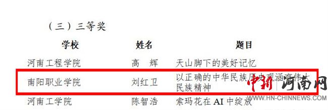 此次获奖是对学校铸牢中华民族共同体意识教育工作的充分肯定。下一步,学校将继续围绕立德树人根本任务,进一步创新教育形式、丰富活动内涵、打造育人品牌,持续推动铸牢中华民族共同体意识教育走深走实,为培养担当民族复兴大任的时代新人贡献力量。(南阳职业学院供稿)