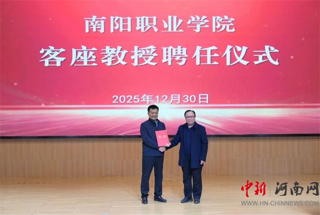 南阳职业学院党委副书记、校长郭建生代表学校向邓志军颁发客座教授聘书。