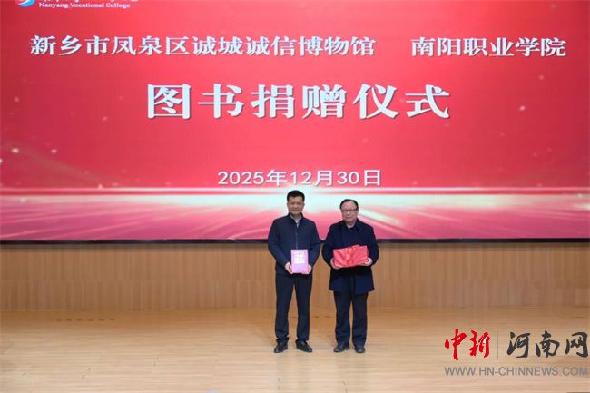 邓志军代表中原诚信博物馆向南阳职业学院赠送《诚信中国》系列丛书,郭建生向其颁发捐赠证书。