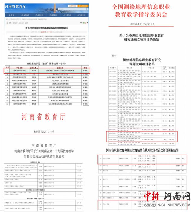 教研与课程建设协同共进,成为教学质量提升的双引擎。学校教科研工作稳步推进,完成2024年2项省级教学改革研究项目结项(含1项重点项目),并成功立项全国测绘地理信息行业教学指导委员会课题2项(含1项重点项目)。在河南省第29届教育教学信息化交流活动中其中《数智寻根,神话筑信:中西创世的云端对话》(微课)等9项作品在高等教育组获奖,其中一等奖1项,二等奖4项,三等奖4项,展现了信息技术与教学融合的创新成果。课程建设方面取得标志性进展,1门课程荣获高校思政示范“金课”特等奖,2门课程通过河南省职业教育和继续教育精品在线开放课程首次评价,课程育人实效与数字化建设水平同步增强。