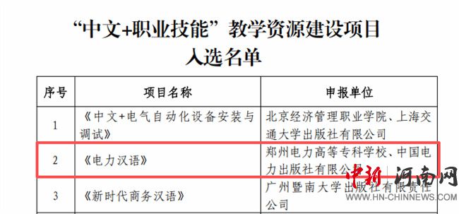 郑州电力高等专科学校教材入选教育部中外语言交流合作中心“中文+职业技能”教学资源