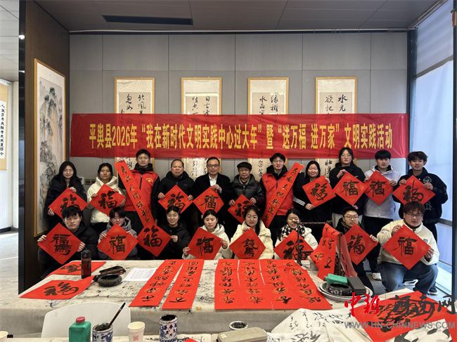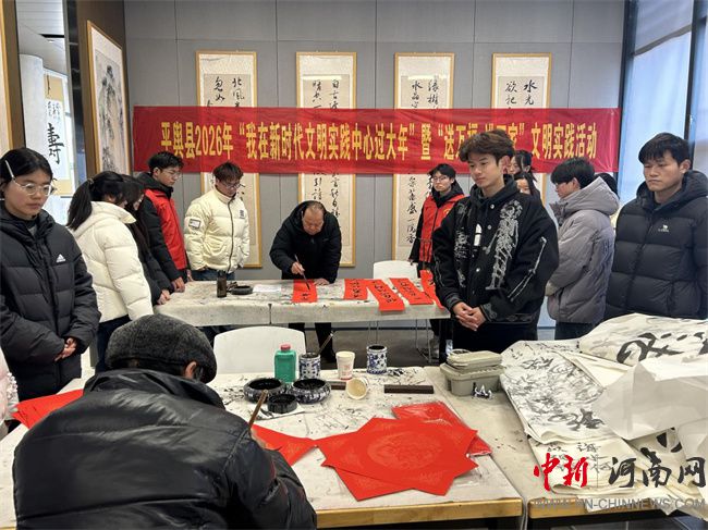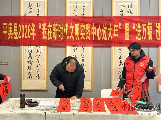 中新河南网2月13日电(赵运领、单金蝉) 为弘扬中华优秀传统文化,营造喜庆祥和的节日氛围,丰富群众精神文化生活,2月10日下午,平舆县新时代文明实践中心热闹开启“我在新时代文明实践中心过大年”暨“送万福 进万家”文明实践活动。活动特别邀请国家级、省级书法名家现场挥毫,免费为群众书写春联与福字;返乡大学生志愿者们也积极加入服务队伍,用笔墨传递温情,将新春祝福送到千家万户。