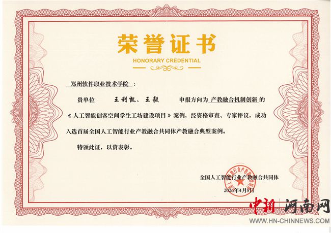 中新河南网4月29日电(文图/孙丰菊) 4月17日,“具身启智·永创未来”具身智能数据赋能创新发展研讨会暨全国人工智能行业产教融合共同体2025年年会在重庆市永川区举行。会上公布了2025年产教融合典型案例获奖名单,郑州软件职业技术学院申报的《人工智能创客空间学生工坊建设项目》从全国众多案例中脱颖而出,成功入选。这一成果充分彰显了学校在产教融合、校企合作领域的创新实践与突出成效。
