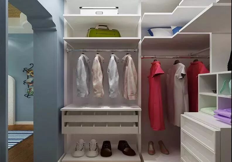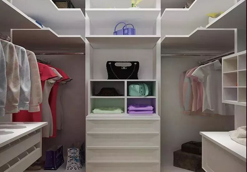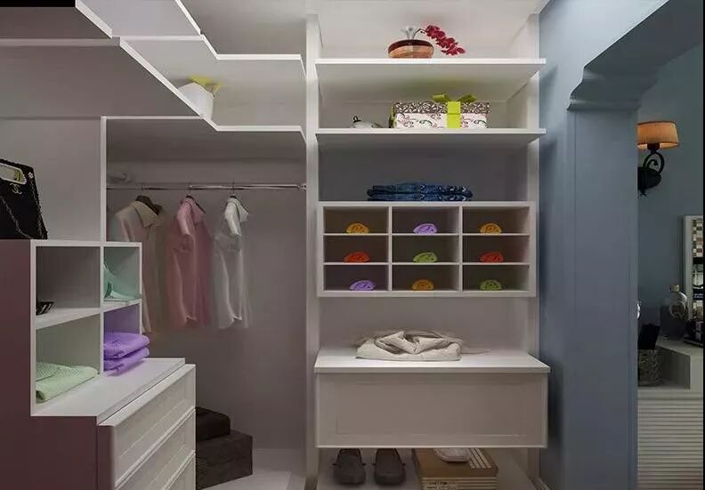 衣帽间不大却五脏俱全,叠放区、挂衣区、杂物去、大件区等都有了清晰的划分,更充满人性化的设计,如不同高度的挂衣区满足长短衣物的挂放,又如横纵组合的设计将空间的利用发挥到极致。