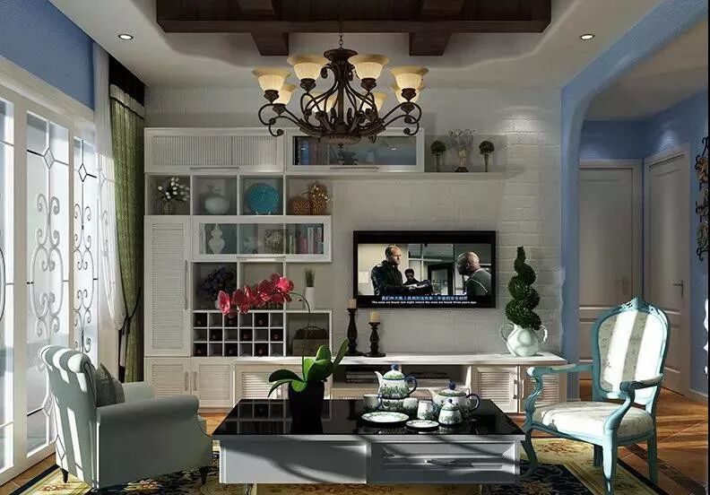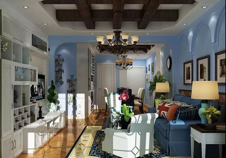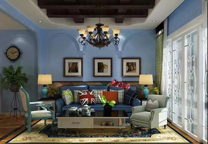 高挑的落地窗将阳光引入客厅,空间流动着静谧和谐的气韵。亮蓝色背景墙与白色家具完美搭配,几何线条的不凡魅力充斥在空间中,呈现一种至臻完美的生活情景。