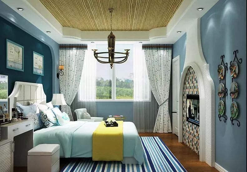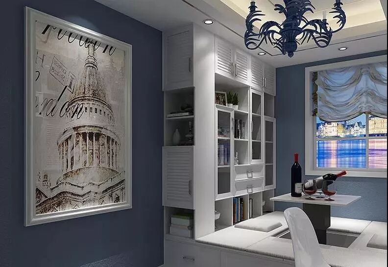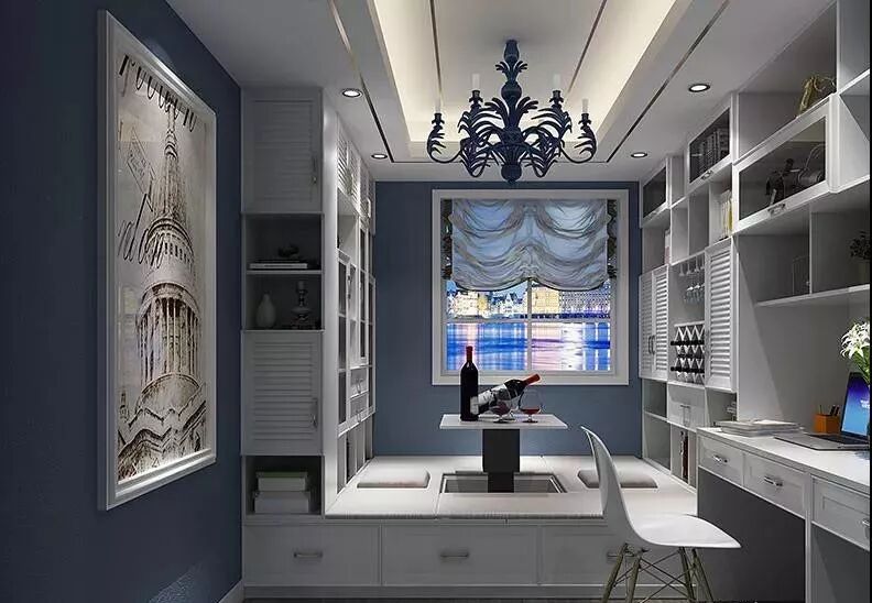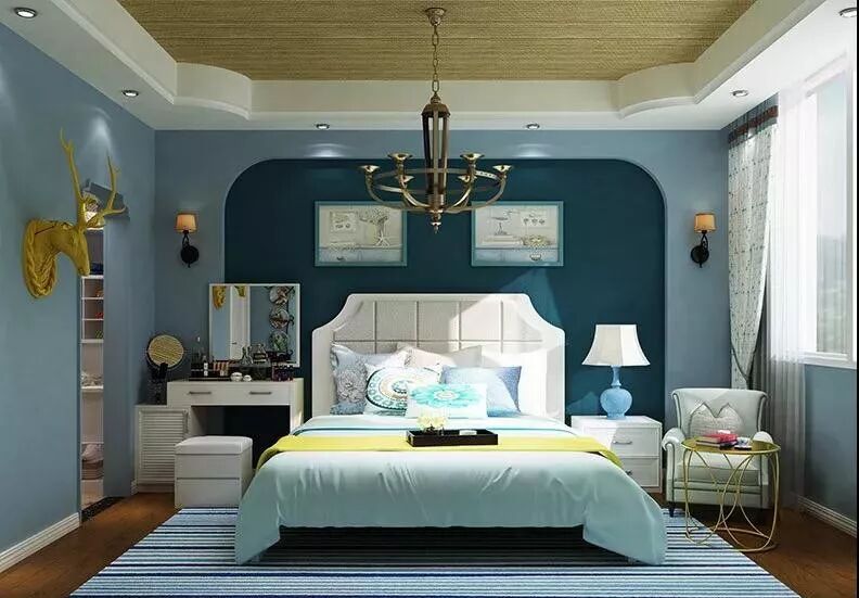 卧室的蓝色从床单、电视背景墙、床头背景墙呈逐步加深的特点,让蓝色充满层次感,与纯净的白色家具搭配,营造出轻盈平和的氛围。暖色木质地板的加入,用简单却不单调的颜色搭配,过滤了原本饱和度的强烈和浓重,显得更加柔和优雅。