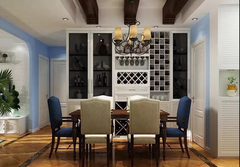餐厅依旧延续主色调的搭配,蓝色系的幽静高雅、暖白色调的朴素恬淡,营造远离喧嚣的生活氛围。酒柜以菱形柜格与方正柜格打造纵横交错的美感,而灰色系玻璃镜面柜门则带来虚实交错的视觉体验,一个风情独居的灯盏,让欧式的华丽注入温馨。
